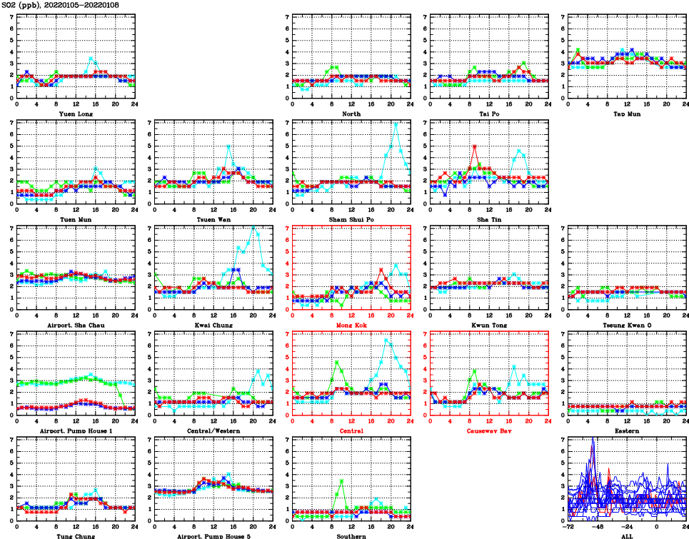 | Air Quality Data Time Series for SO2 (2022/01/08) | ( Line colors: Day -3 Day -2 Day -1 Current day ) | 2D Map Current AQHI |