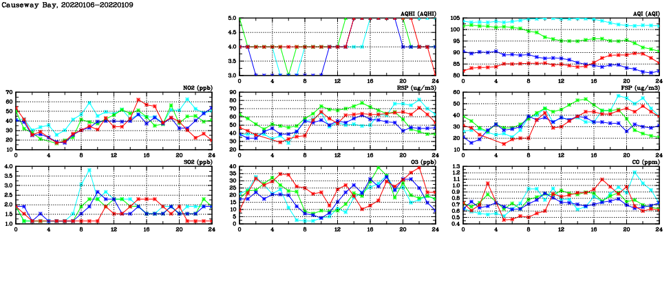 | Air Quality Data Time Series in Causeway Bay (2022/01/09) | ( Line colors: Day -3 Day -2 Day -1 Current day ) | 2D Map Current AQHI |