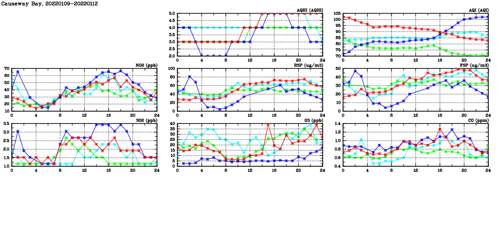 | Air Quality Data Time Series in Causeway Bay (2022/01/12) | ( Line colors: Day -3 Day -2 Day -1 Current day ) | 2D Map Current AQHI |
