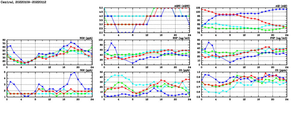 | Air Quality Data Time Series in Central (2022/01/12) | ( Line colors: Day -3 Day -2 Day -1 Current day ) | 2D Map Current AQHI |