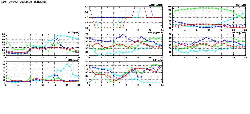 | Air Quality Data Time Series in Kwai Chung (2022/01/08) | ( Line colors: Day -3 Day -2 Day -1 Current day ) | 2D Map Current AQHI |
