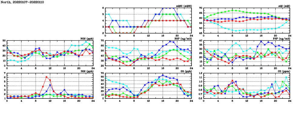 | Air Quality Data Time Series in North (2022/01/10) | ( Line colors: Day -3 Day -2 Day -1 Current day ) | 2D Map Current AQHI |