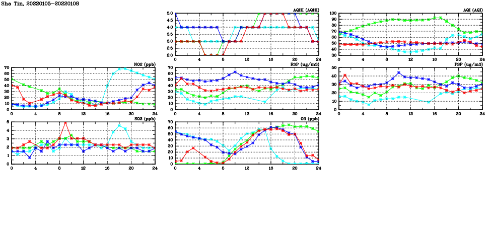 | Air Quality Data Time Series in Sha Tin (2022/01/08) | ( Line colors: Day -3 Day -2 Day -1 Current day ) | 2D Map Current AQHI |