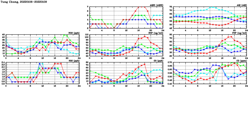 | Air Quality Data Time Series in Tung Chung (2022/01/09) | ( Line colors: Day -3 Day -2 Day -1 Current day ) | 2D Map Current AQHI |