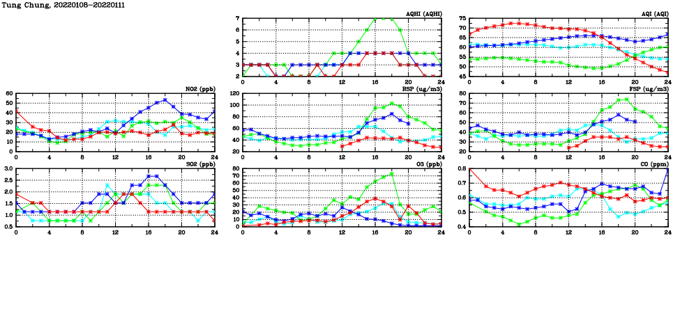| Air Quality Data Time Series in Tung Chung (2022/01/11) | ( Line colors: Day -3 Day -2 Day -1 Current day ) | 2D Map Current AQHI |