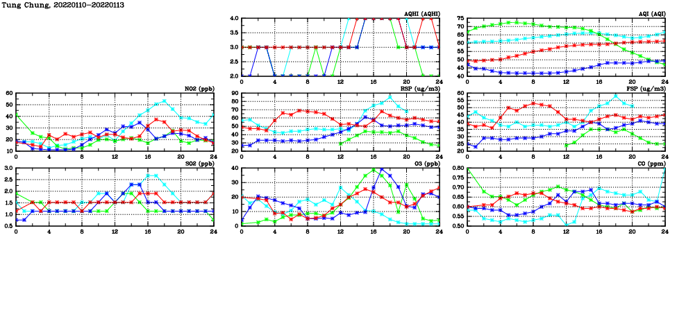 | Air Quality Data Time Series in Tung Chung (2022/01/13) | ( Line colors: Day -3 Day -2 Day -1 Current day ) | 2D Map Current AQHI |