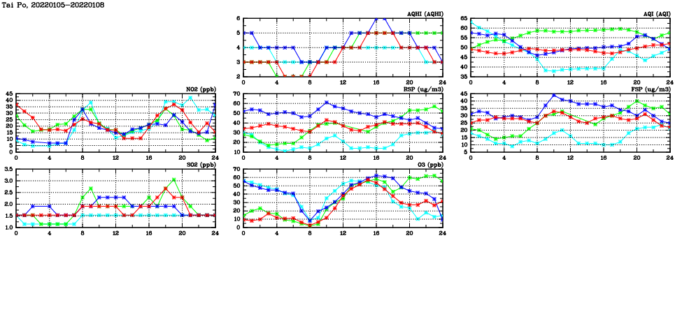 | Air Quality Data Time Series in Tai Po (2022/01/08) | ( Line colors: Day -3 Day -2 Day -1 Current day ) | 2D Map Current AQHI |
