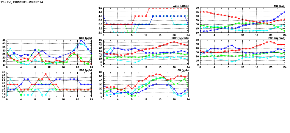 | Air Quality Data Time Series in Tai Po (2022/01/14) | ( Line colors: Day -3 Day -2 Day -1 Current day ) | 2D Map Current AQHI |