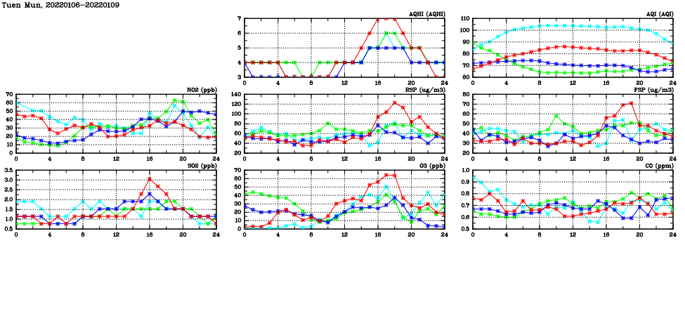 | Air Quality Data Time Series in Tuen Mun (2022/01/09) | ( Line colors: Day -3 Day -2 Day -1 Current day ) | 2D Map Current AQHI |