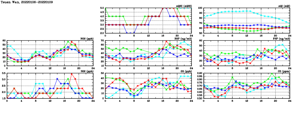 | Air Quality Data Time Series in Tsuen Wan (2022/01/09) | ( Line colors: Day -3 Day -2 Day -1 Current day ) | 2D Map Current AQHI |