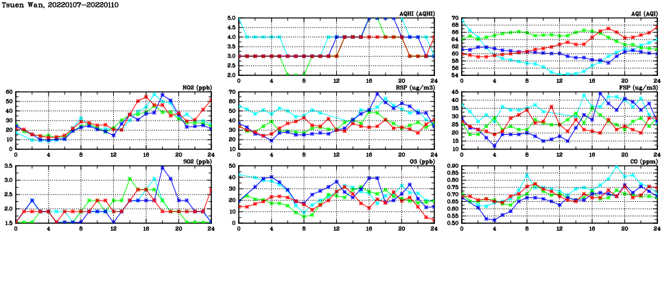 | Air Quality Data Time Series in Tsuen Wan (2022/01/10) | ( Line colors: Day -3 Day -2 Day -1 Current day ) | 2D Map Current AQHI |