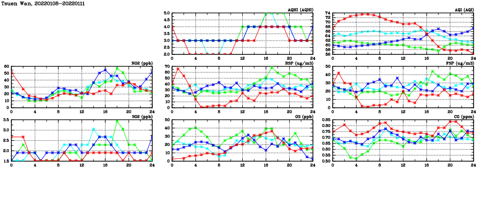 | Air Quality Data Time Series in Tsuen Wan (2022/01/11) | ( Line colors: Day -3 Day -2 Day -1 Current day ) | 2D Map Current AQHI |