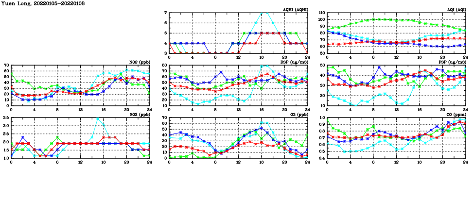 | Air Quality Data Time Series in Yuen Long (2022/01/08) | ( Line colors: Day -3 Day -2 Day -1 Current day ) | 2D Map Current AQHI |