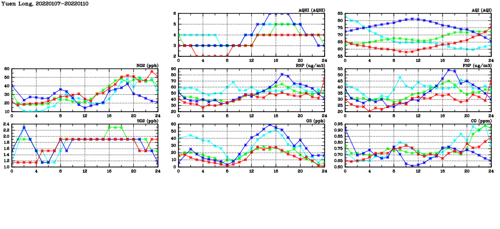 | Air Quality Data Time Series in Yuen Long (2022/01/10) | ( Line colors: Day -3 Day -2 Day -1 Current day ) | 2D Map Current AQHI |