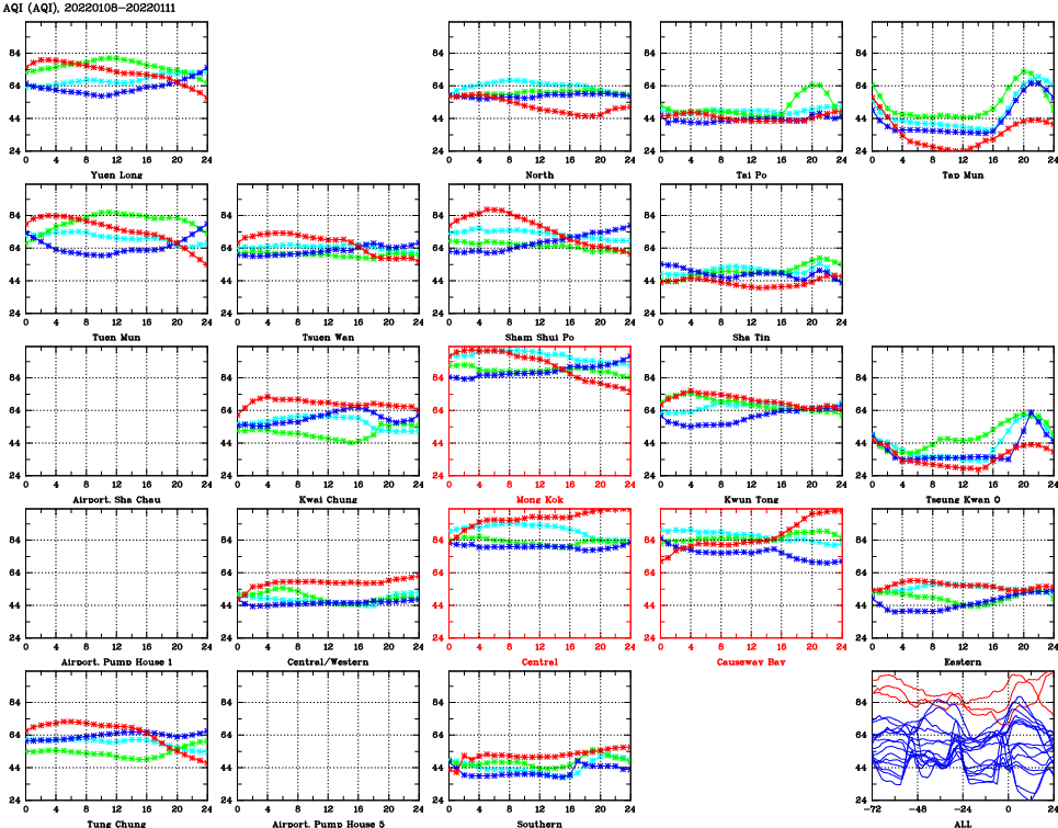| Air Quality Data Time Series for AQI (2022/01/11) | ( Line colors: Day -3 Day -2 Day -1 Current day ) | 2D Map Current AQHI |