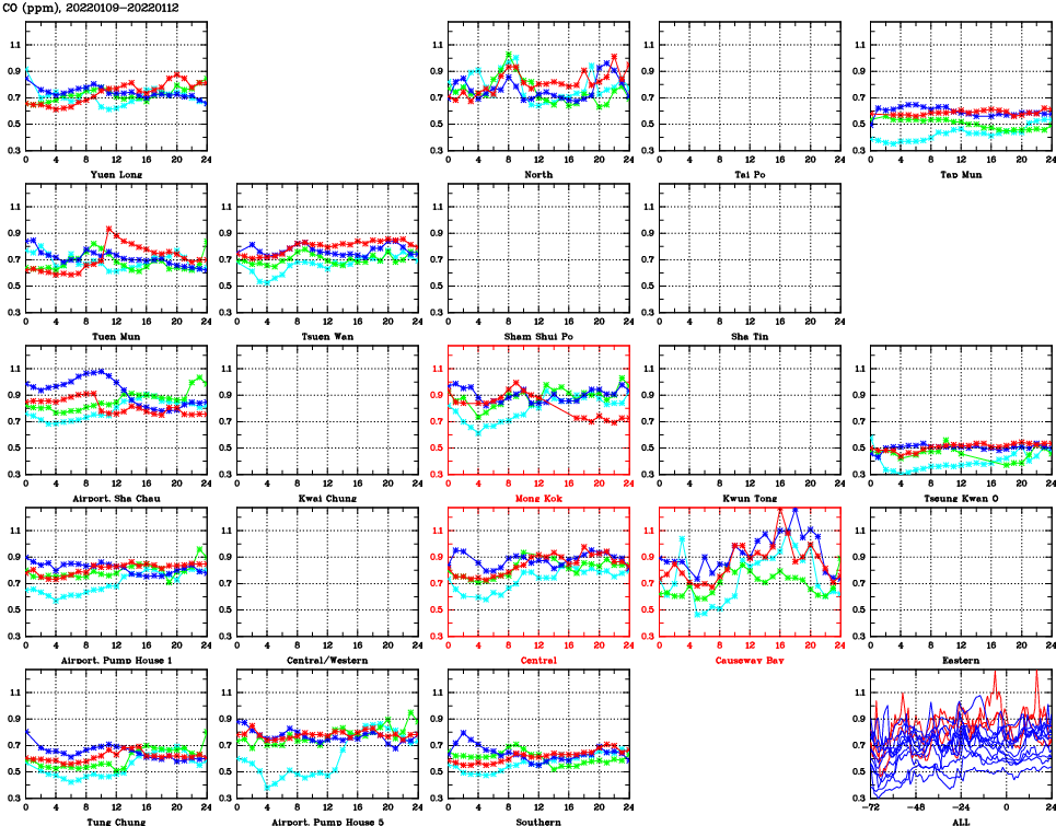 | Air Quality Data Time Series for CO (2022/01/12) | ( Line colors: Day -3 Day -2 Day -1 Current day ) | 2D Map Current AQHI |