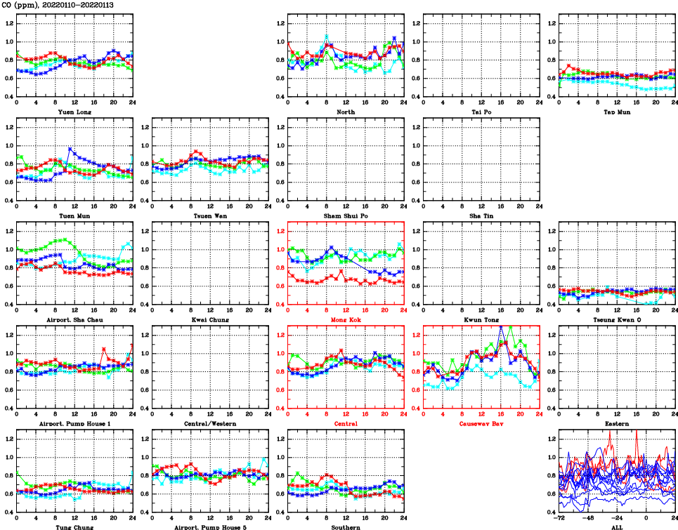 | Air Quality Data Time Series for CO (2022/01/13) | ( Line colors: Day -3 Day -2 Day -1 Current day ) | 2D Map Current AQHI |