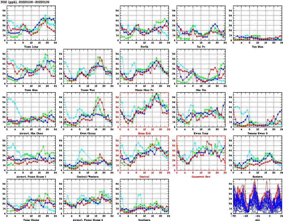| Air Quality Data Time Series for NO2 (2022/01/09) | ( Line colors: Day -3 Day -2 Day -1 Current day ) | 2D Map Current AQHI |