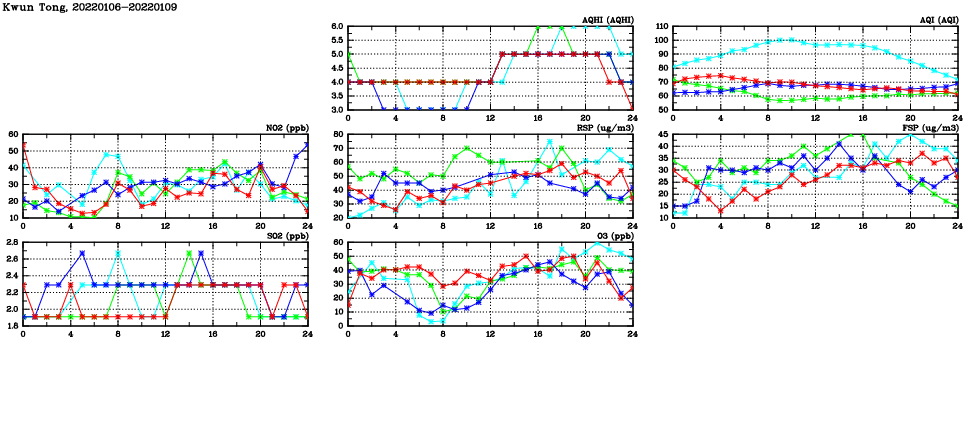 | Air Quality Data Time Series in Kwun Tong (2022/01/09) | ( Line colors: Day -3 Day -2 Day -1 Current day ) | 2D Map Current AQHI |