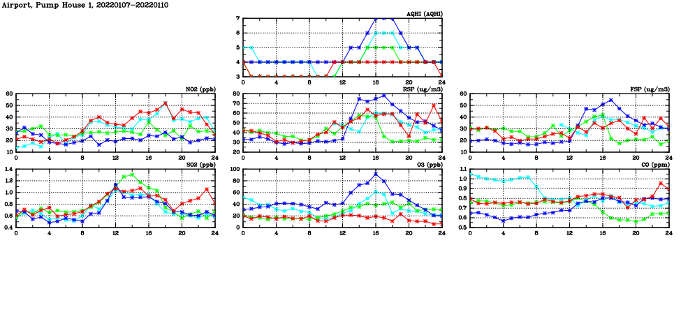 | Air Quality Data Time Series in Airport, Pump House 1 (2022/01/10) | ( Line colors: Day -3 Day -2 Day -1 Current day ) | 2D Map Current AQHI |