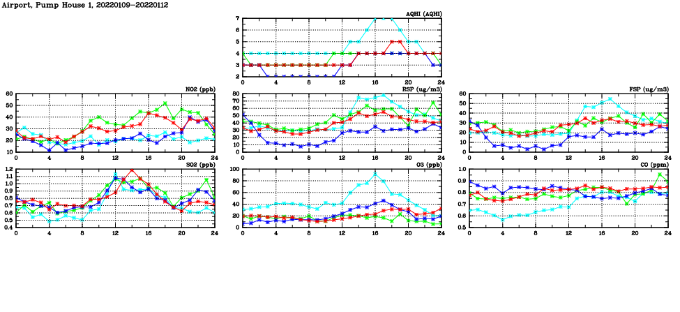 | Air Quality Data Time Series in Airport, Pump House 1 (2022/01/12) | ( Line colors: Day -3 Day -2 Day -1 Current day ) | 2D Map Current AQHI |