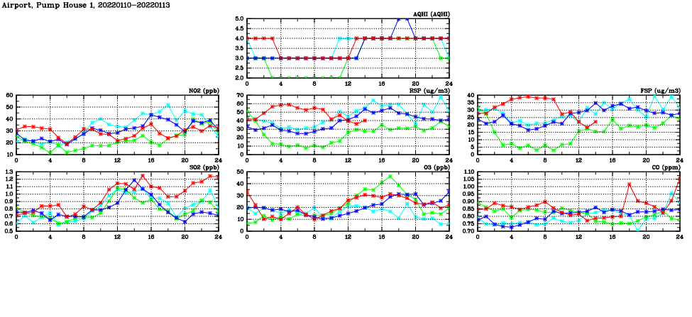 | Air Quality Data Time Series in Airport, Pump House 1 (2022/01/13) | ( Line colors: Day -3 Day -2 Day -1 Current day ) | 2D Map Current AQHI |