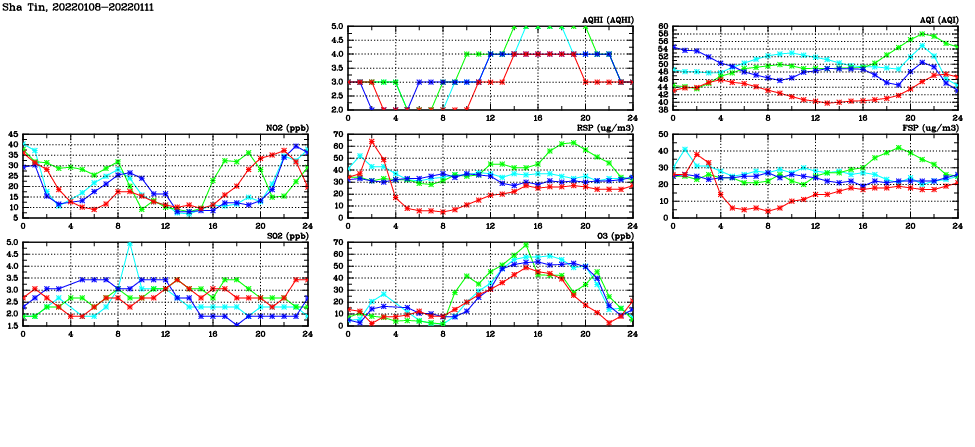 | Air Quality Data Time Series in Sha Tin (2022/01/11) | ( Line colors: Day -3 Day -2 Day -1 Current day ) | 2D Map Current AQHI |