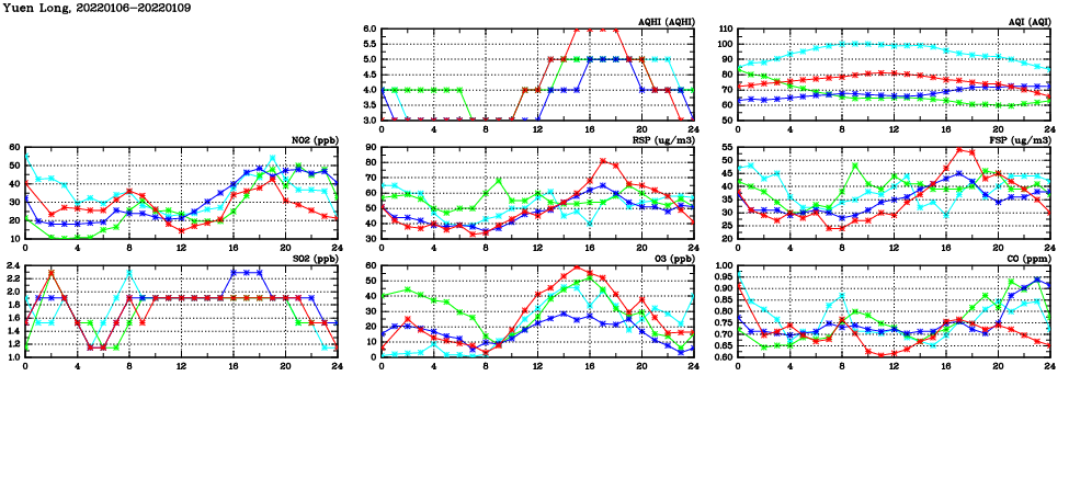 | Air Quality Data Time Series in Yuen Long (2022/01/09) | ( Line colors: Day -3 Day -2 Day -1 Current day ) | 2D Map Current AQHI |