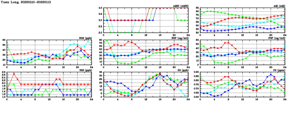 | Air Quality Data Time Series in Yuen Long (2022/01/13) | ( Line colors: Day -3 Day -2 Day -1 Current day ) | 2D Map Current AQHI |