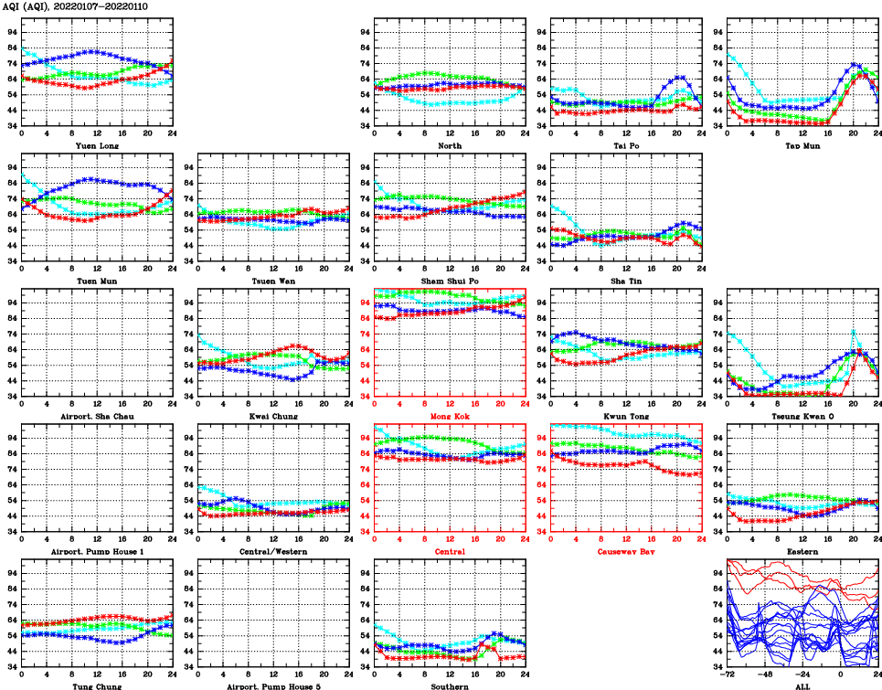 | Air Quality Data Time Series for AQI (2022/01/10) | ( Line colors: Day -3 Day -2 Day -1 Current day ) | 2D Map Current AQHI |