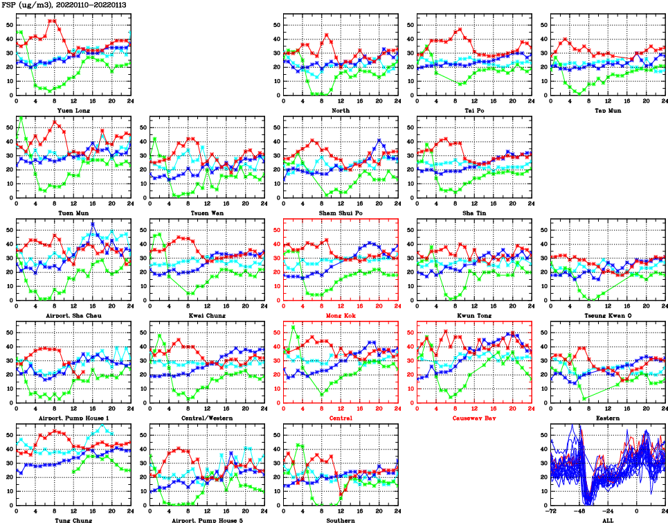 | Air Quality Data Time Series for FSP (2022/01/13) | ( Line colors: Day -3 Day -2 Day -1 Current day ) | 2D Map Current AQHI |