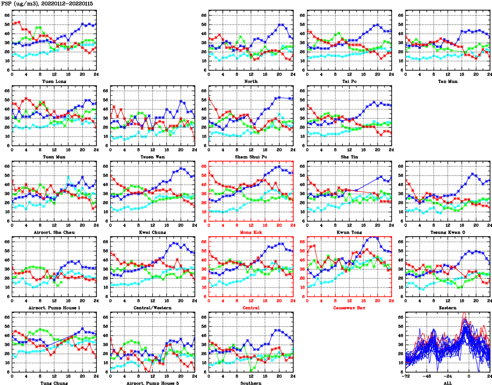 | Air Quality Data Time Series for FSP (2022/01/15) | ( Line colors: Day -3 Day -2 Day -1 Current day ) | 2D Map Current AQHI |