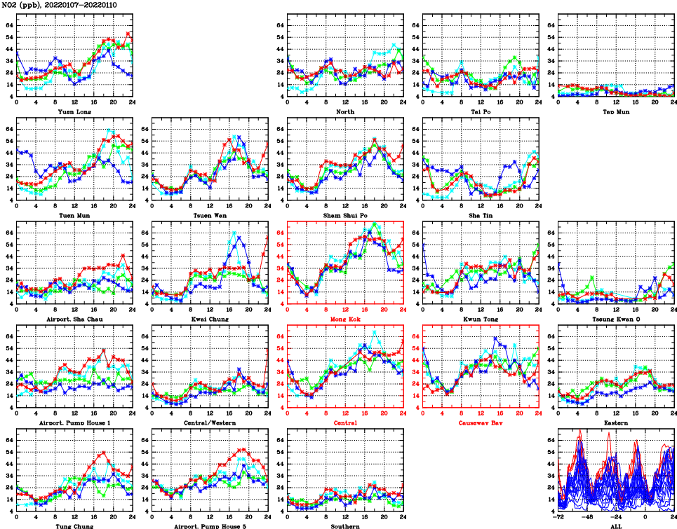 | Air Quality Data Time Series for NO2 (2022/01/10) | ( Line colors: Day -3 Day -2 Day -1 Current day ) | 2D Map Current AQHI |