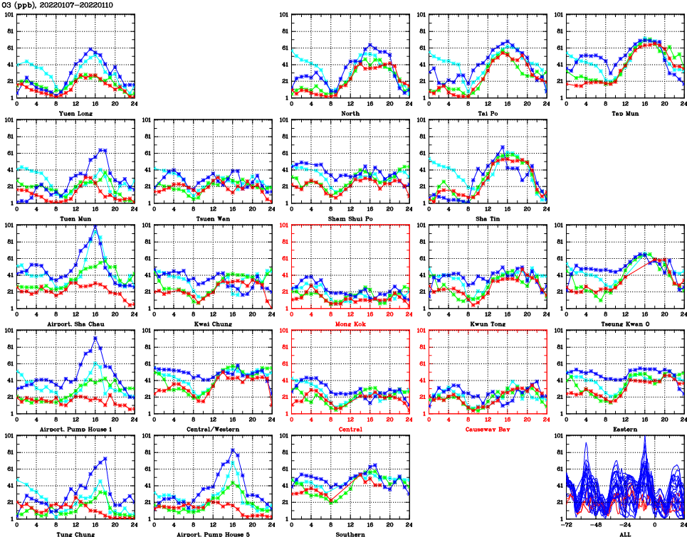 | Air Quality Data Time Series for O3 (2022/01/10) | ( Line colors: Day -3 Day -2 Day -1 Current day ) | 2D Map Current AQHI |
