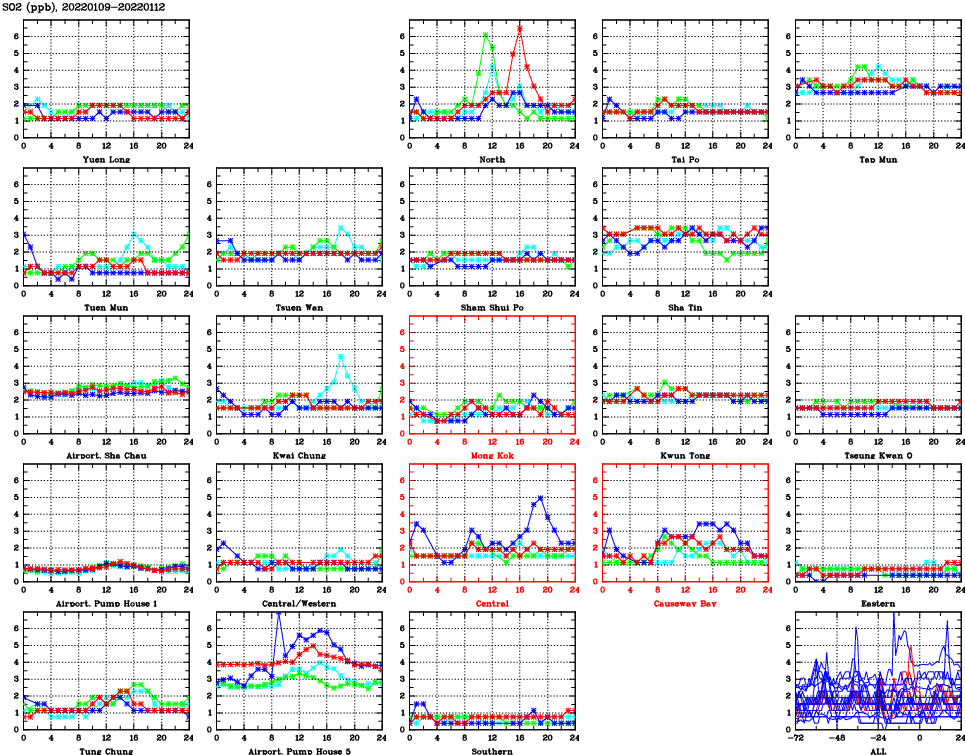 | Air Quality Data Time Series for SO2 (2022/01/12) | ( Line colors: Day -3 Day -2 Day -1 Current day ) | 2D Map Current AQHI |