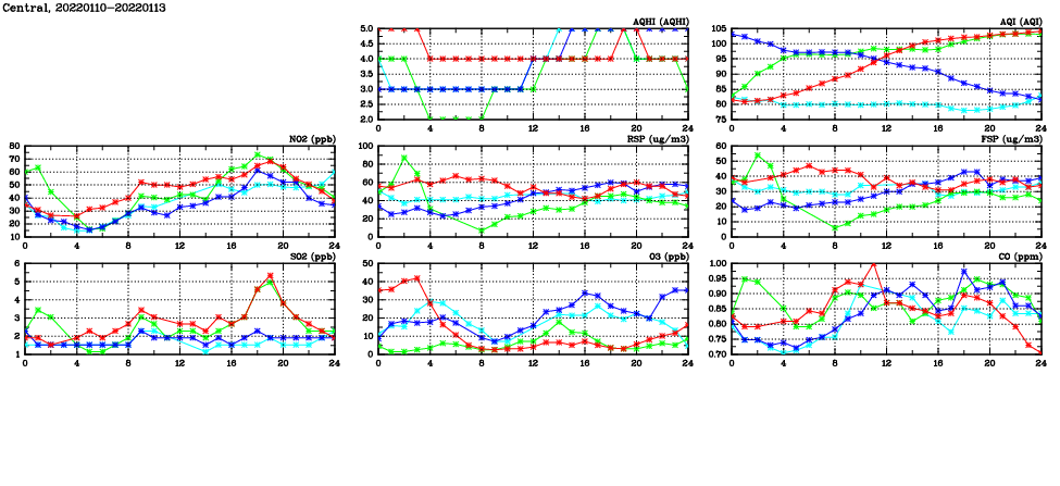 | Air Quality Data Time Series in Central (2022/01/13) | ( Line colors: Day -3 Day -2 Day -1 Current day ) | 2D Map Current AQHI |