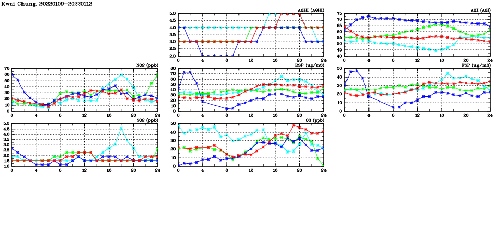 | Air Quality Data Time Series in Kwai Chung (2022/01/12) | ( Line colors: Day -3 Day -2 Day -1 Current day ) | 2D Map Current AQHI |