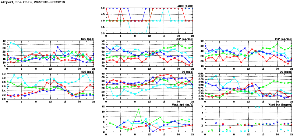 | Air Quality Data Time Series in Airport, Sha Chau (2022/01/16) | ( Line colors: Day -3 Day -2 Day -1 Current day ) | 2D Map Current AQHI |