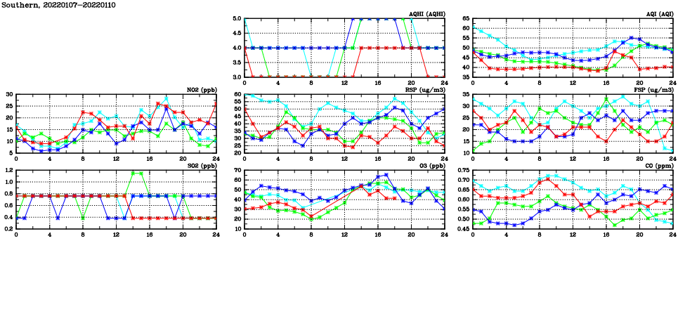 | Air Quality Data Time Series in Southern (2022/01/10) | ( Line colors: Day -3 Day -2 Day -1 Current day ) | 2D Map Current AQHI |