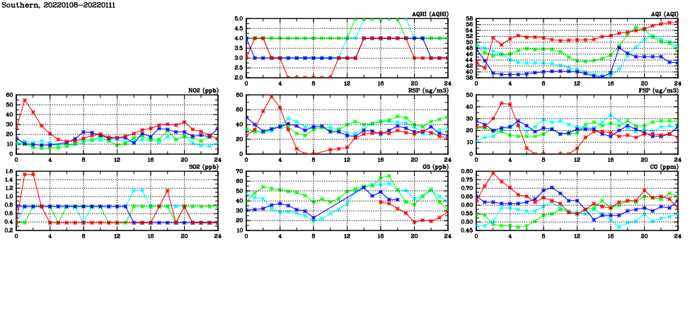 | Air Quality Data Time Series in Southern (2022/01/11) | ( Line colors: Day -3 Day -2 Day -1 Current day ) | 2D Map Current AQHI |