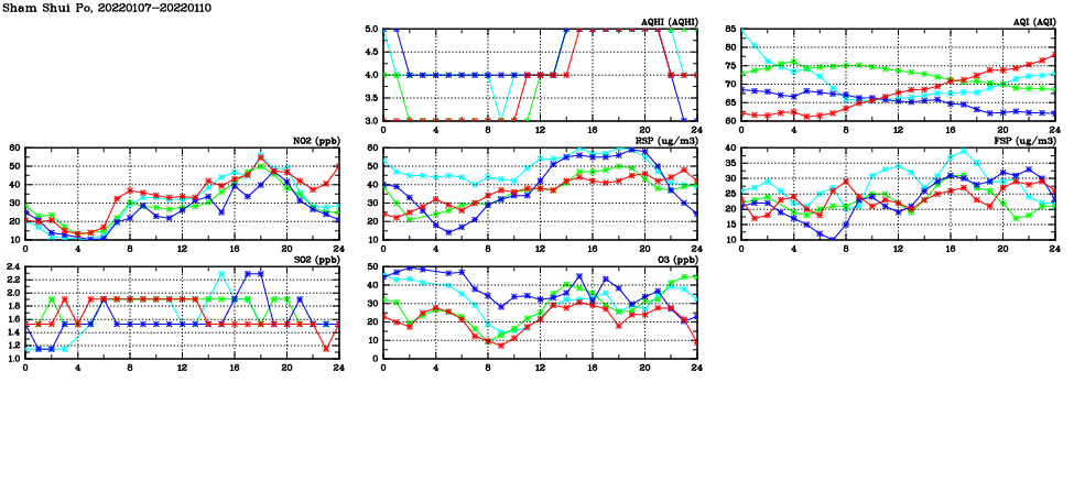 | Air Quality Data Time Series in Sham Shui Po (2022/01/10) | ( Line colors: Day -3 Day -2 Day -1 Current day ) | 2D Map Current AQHI |