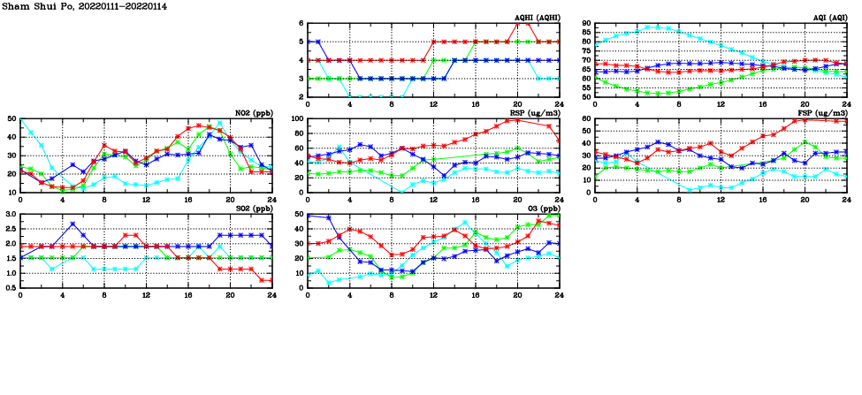 | Air Quality Data Time Series in Sham Shui Po (2022/01/14) | ( Line colors: Day -3 Day -2 Day -1 Current day ) | 2D Map Current AQHI |