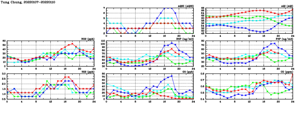 | Air Quality Data Time Series in Tung Chung (2022/01/10) | ( Line colors: Day -3 Day -2 Day -1 Current day ) | 2D Map Current AQHI |