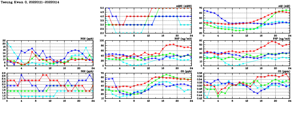 | Air Quality Data Time Series in Tseung Kwan O (2022/01/14) | ( Line colors: Day -3 Day -2 Day -1 Current day ) | 2D Map Current AQHI |