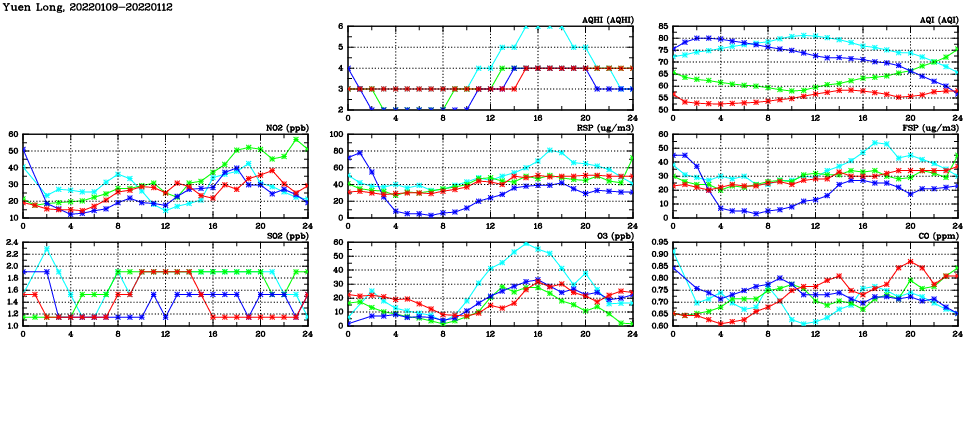 | Air Quality Data Time Series in Yuen Long (2022/01/12) | ( Line colors: Day -3 Day -2 Day -1 Current day ) | 2D Map Current AQHI |