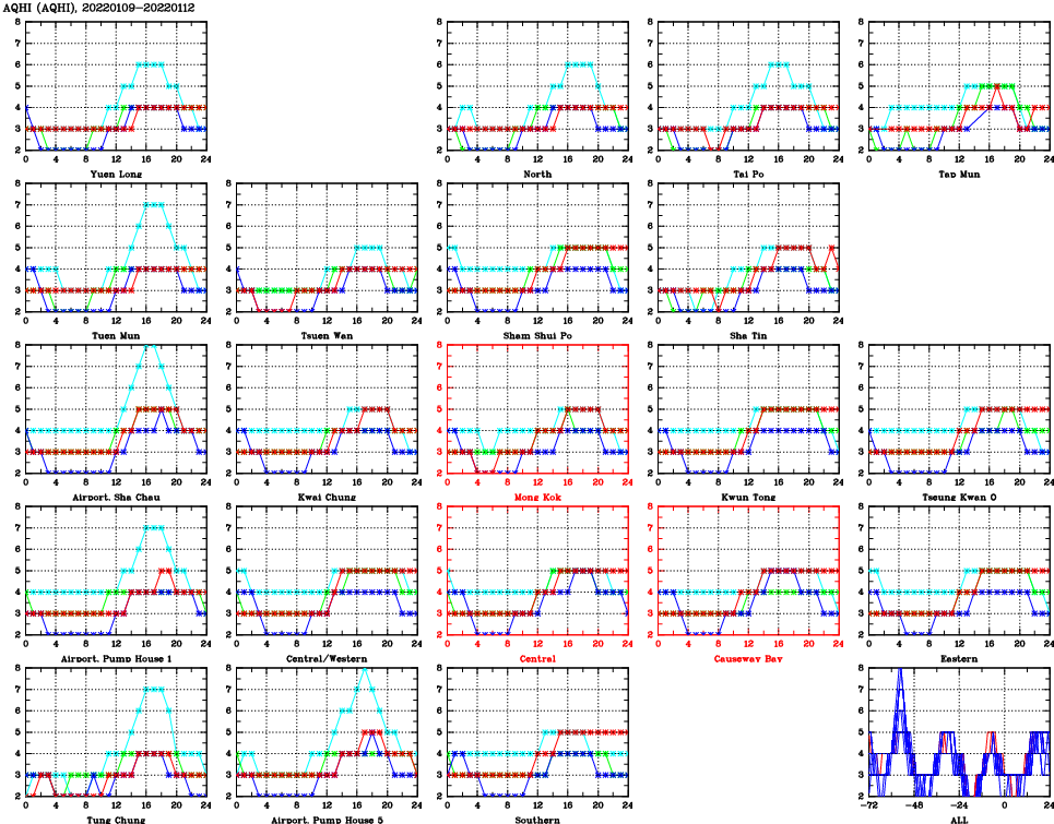 | Air Quality Data Time Series for AQHI (2022/01/12) | ( Line colors: Day -3 Day -2 Day -1 Current day ) | 2D Map Current AQHI |