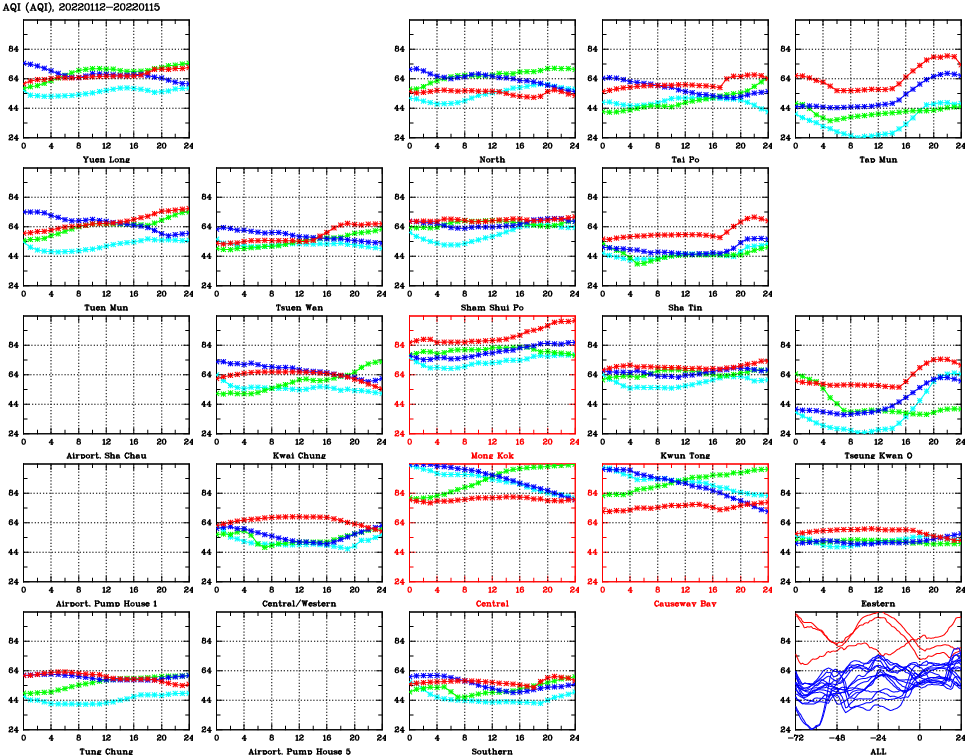 | Air Quality Data Time Series for AQI (2022/01/15) | ( Line colors: Day -3 Day -2 Day -1 Current day ) | 2D Map Current AQHI |