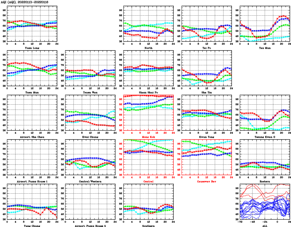 | Air Quality Data Time Series for AQI (2022/01/16) | ( Line colors: Day -3 Day -2 Day -1 Current day ) | 2D Map Current AQHI |