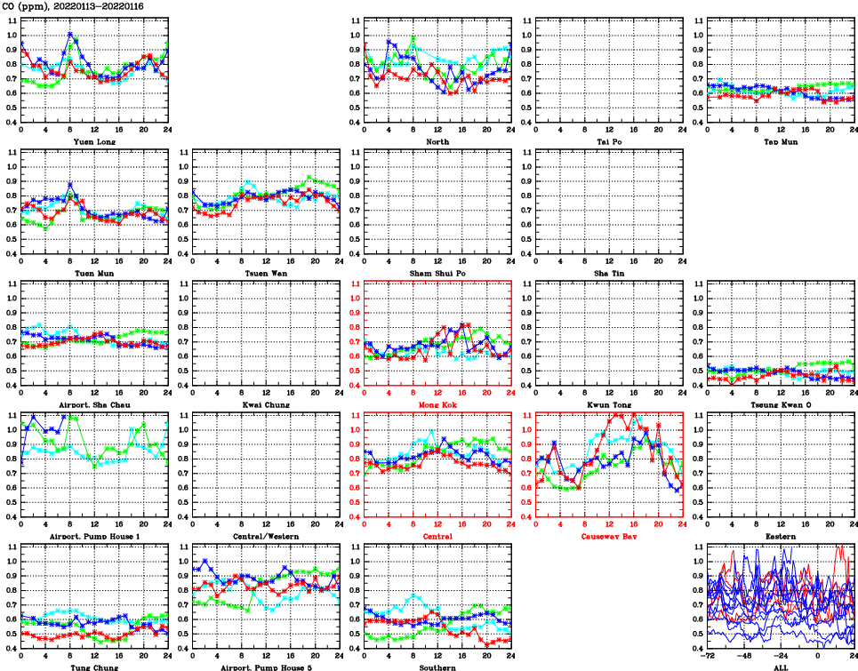 | Air Quality Data Time Series for CO (2022/01/16) | ( Line colors: Day -3 Day -2 Day -1 Current day ) | 2D Map Current AQHI |