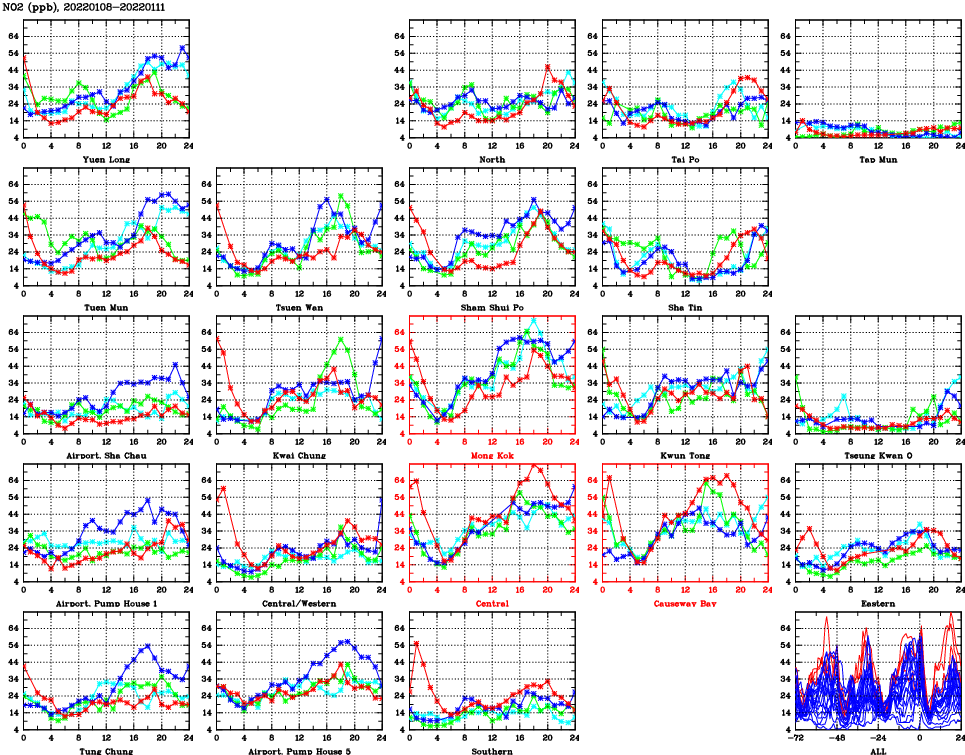 | Air Quality Data Time Series for NO2 (2022/01/11) | ( Line colors: Day -3 Day -2 Day -1 Current day ) | 2D Map Current AQHI |